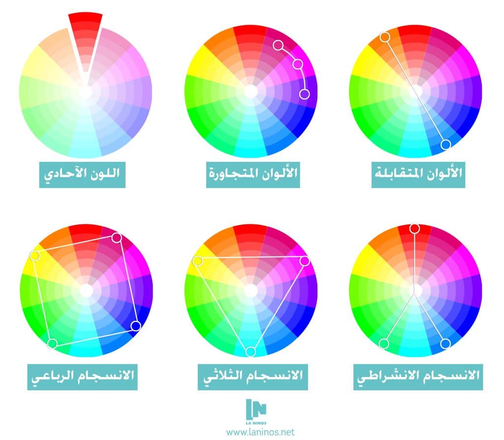 – الانسجام الانشراطي: اللون الرئيسي واللونين المجاوريين للون المقابل.